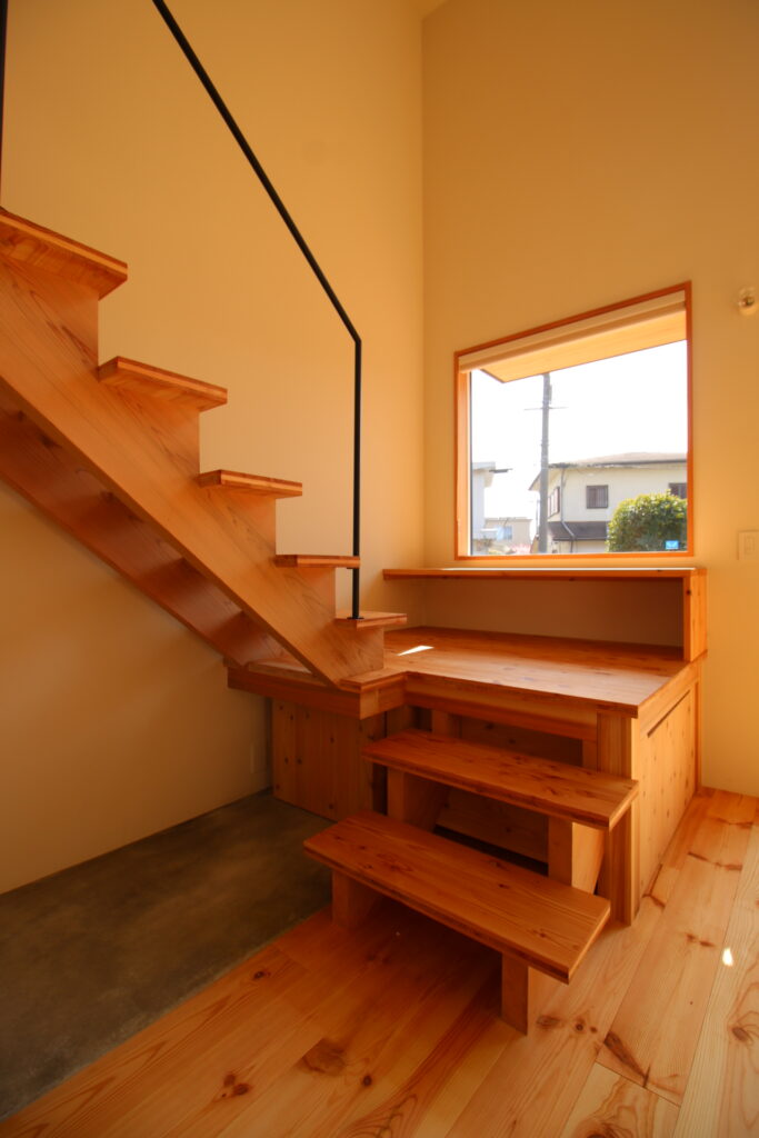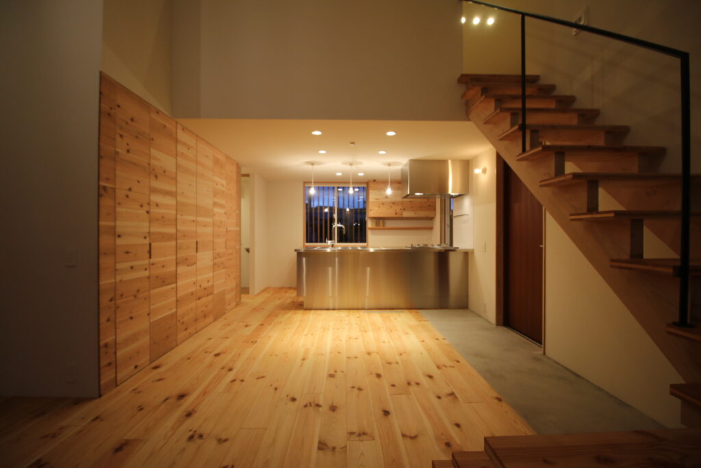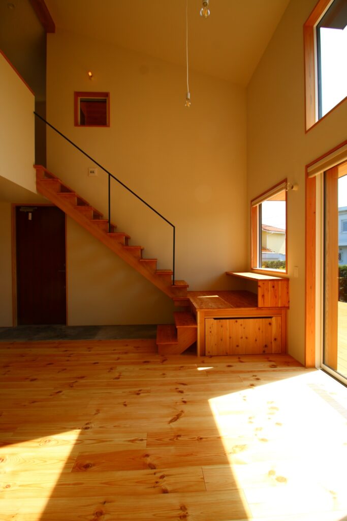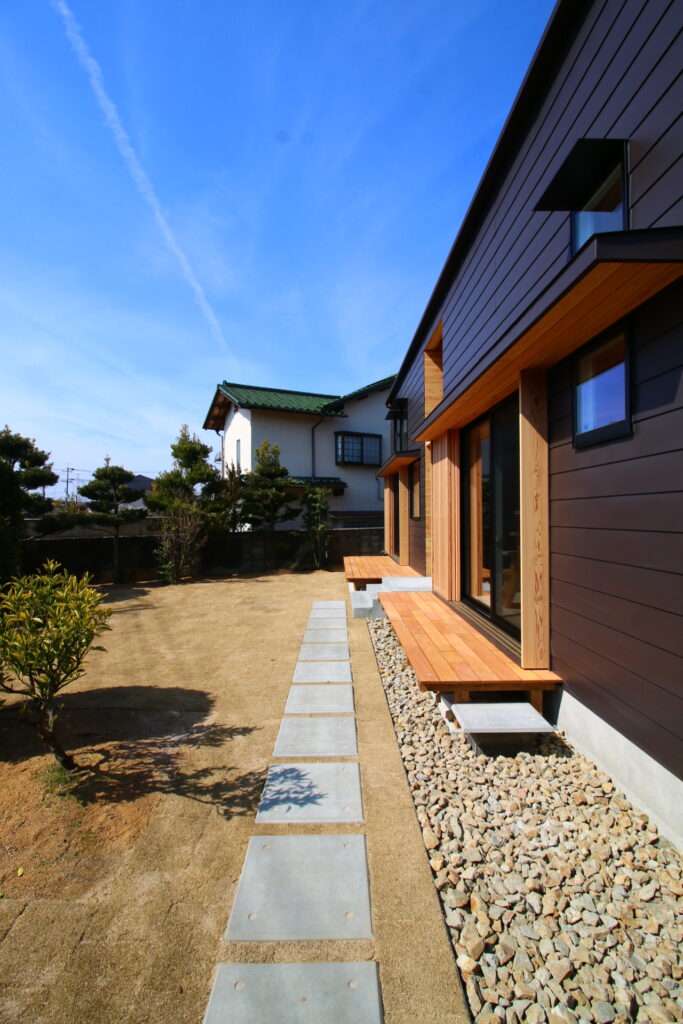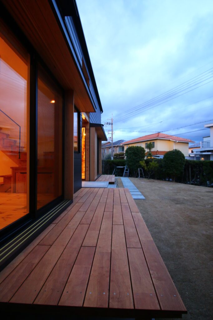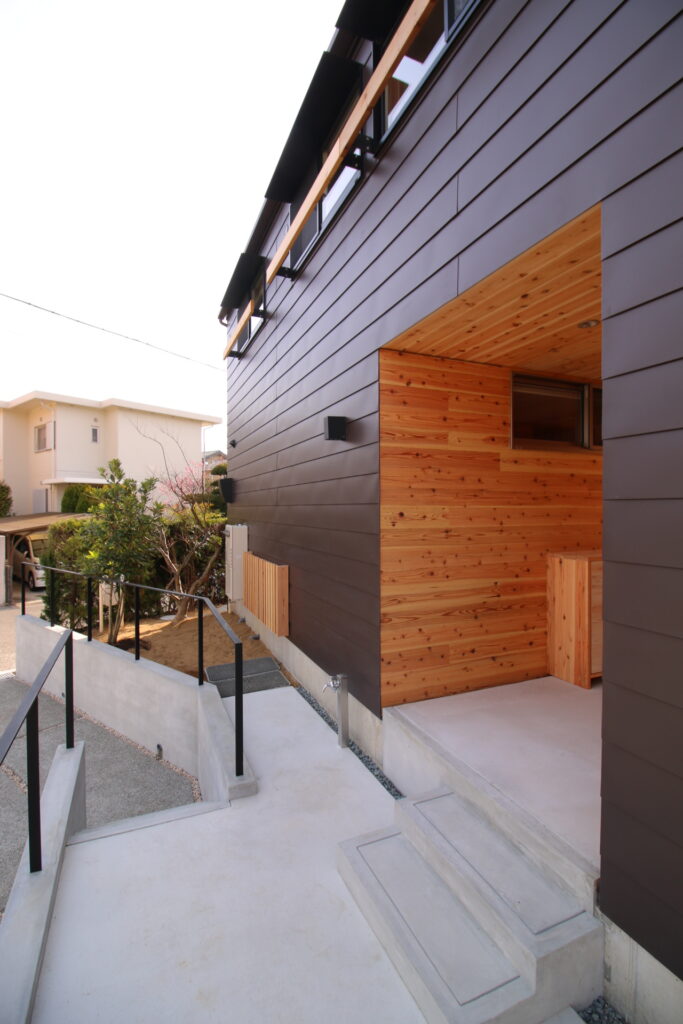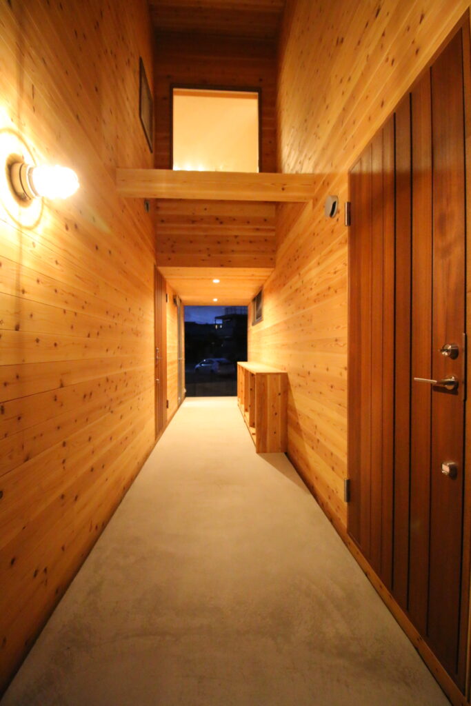 When you think of a two-family house, people take care of each other and are taken care of by each other. In the past, it may have been a form that was avoided. I tried to think about such a two-family house with just the right distance. For example, there is an alley, and two households face each other through that alley. The alley connects with the outside world and becomes a space for hobbies and a comfortable semi-outside space. The houses are placed diagonally to the site to face the south, and each house receives sunlight in the winter through large atriums on the south side. In the summer, it blocks that sunlight and also blocks the sunlight from the west side. As a vessel for living comfortably throughout the year. The site after the building is arranged diagonally has a parking lot for 3 cars on the west side, from the south garden full of greenery. Make full use of the site. An ultra-energy-saving, highly insulated, highly airtight house that uses half the heating energy of next-generation energy-saving standards. This is a subsidy application property for a regional housing greening project/housing that accommodates three generations living together. Life develops while connecting with family, parents, children’s households, and the outside world. We have created such a “future” two-family home.
