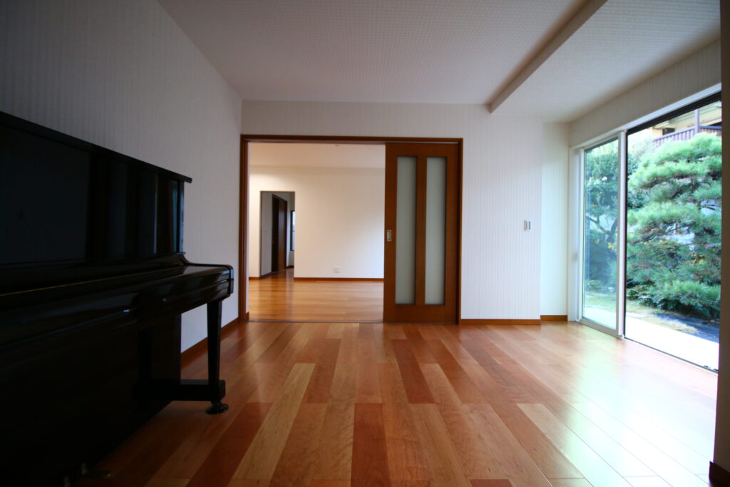 現状の家の使い方をお伺いすると、庭があまり使われていないようだ。この庭に面する居室よりも、道路側のキッチンを中心としたスペースを主に使われている状況がわかってきた。ピアノ室も同様、庭に面し配置されている。ここからの見晴らしも重視したいところ。築昭和38年。和室の構造はきれいに維持されている。既存のキッチンの位置も、プラン変更し、リビングに面し、ダイニングキッチンとして使えるようにプランニング。耐震設計を実施するうえで、今回難易度が高いのが、昭和38年新築以来、なんどか増改築工事をされた来たようで、床面積は200㎡程度にのぼる。その中に、平屋2棟と、2階が1棟。それらが接し建築されているため、耐震計算は、それぞれのエリアを分け3回に分けて計算。かつ、平屋部分、2階部分を分けて。かつ全体で計算の計5回の耐震設計によってクリアするように計画する。耐震性能と合わせて考えたいのが、断熱性能。今回堺市住宅・建築物省エネ改修補助金交付申請を踏まえ、耐震かつ断熱性能も確保できるよう設計を進めた。
