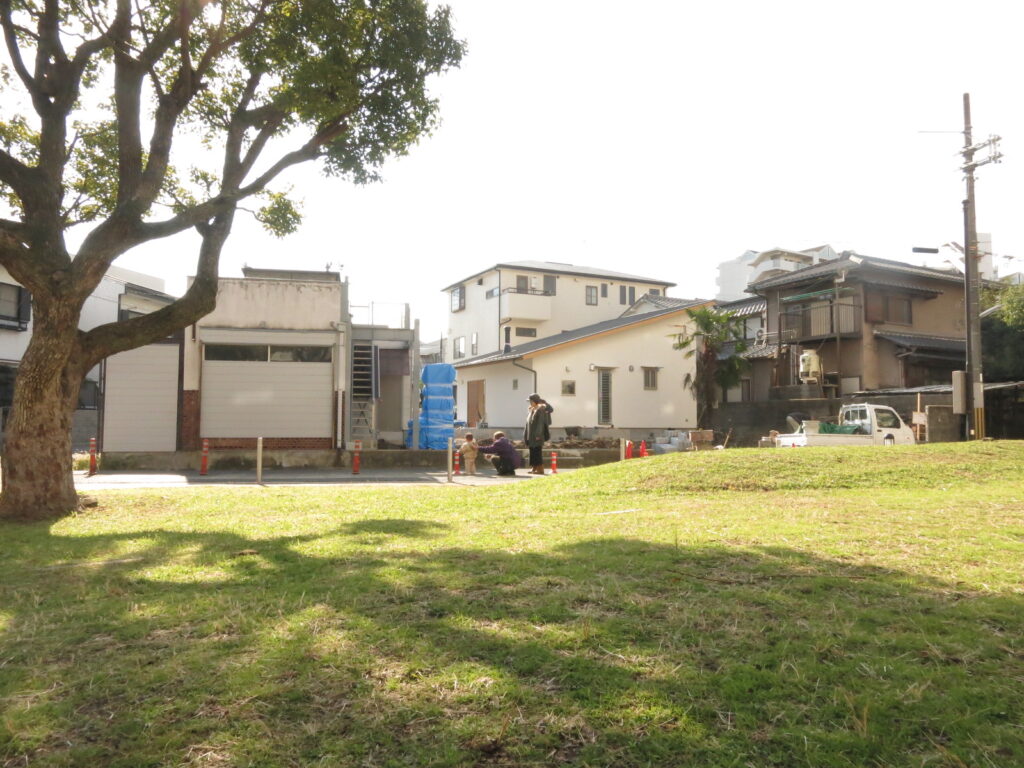 そんな思いを込めた、最期の写真.『それでも、小さな家 in堺』新築工事。解体工事が終わり、それまでの風景とは違う敷地感。きれいに整地された敷地に、地縄を張ってみる。